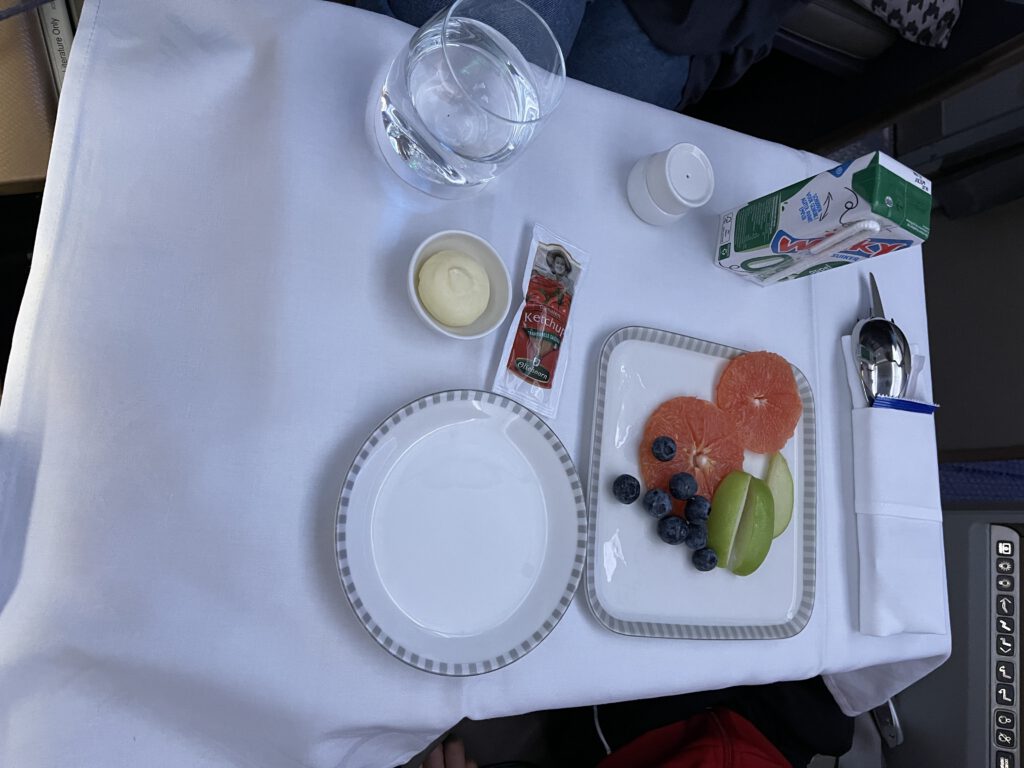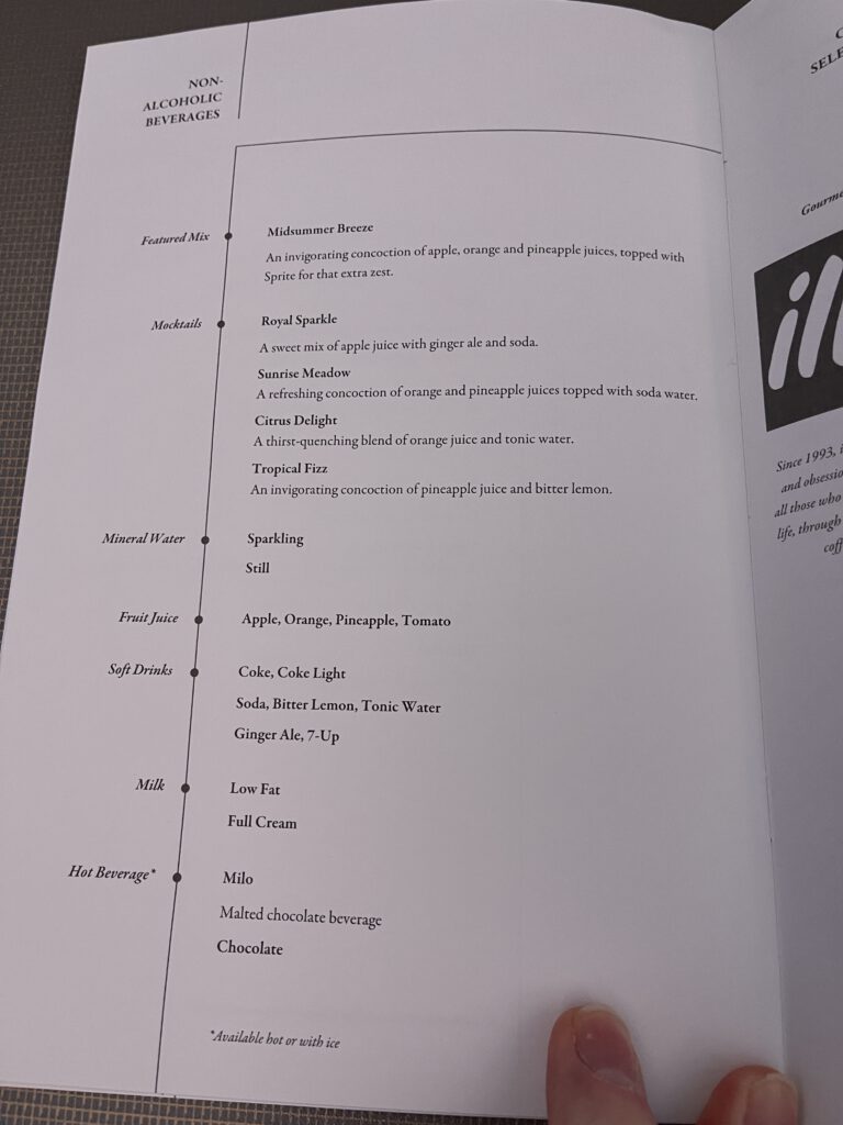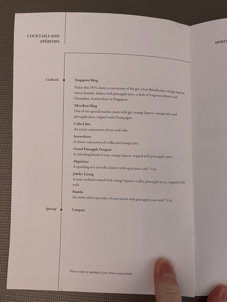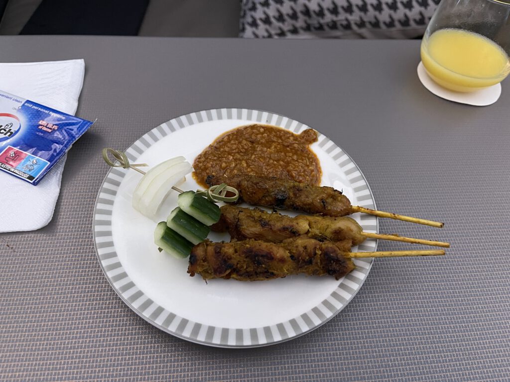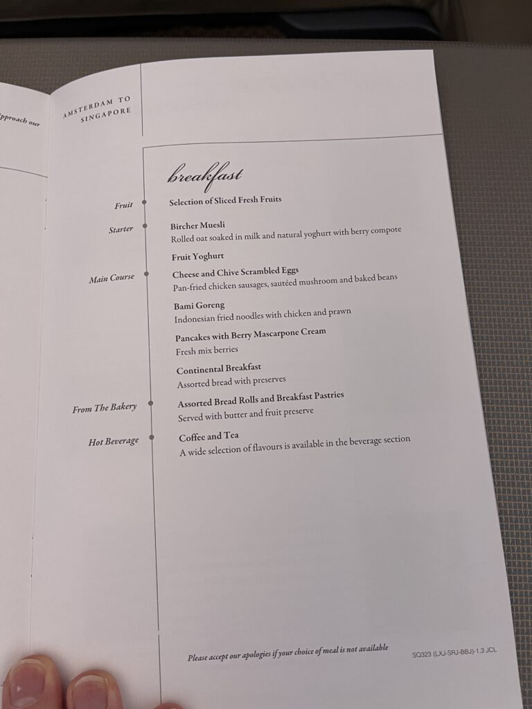 Vorbestellungen funktionieren bei Singapore ein bisschen anders als gewöhnlich: es gibt einen „Book the Cook“ Service, der Spezialitäten des jeweiligen Abfluglandes im Angebot hat. Die mit Abstand größte Auswahl hat man natürlich bei Abflügen aus Singapore. Aber meine eigene Wahl für Mittagessen und Frühstück waren beides Optionen aus dem genannten Book the Cook Programm.